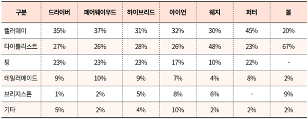 캘러웨이는 드라이버(35%), 페어웨이우드(37%), 하이브리드(31%), 아이언(32%), 그리고 퍼터(45%) 부문에서 사용률 1위에 올랐다. 시즌 3승을 기록한 이예원을 비롯해 이가영, 성유진, 그리고 올해부터 미국으로 떠나는 황유민 등이 캘러웨이의 대표 선수였다.